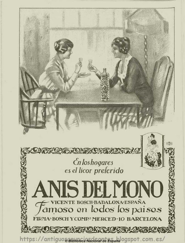 Anuncios de prensa de Anís del Mono en 1909, 1912, 1921, 192, 1923, 1924, 1925, 1927, 1929, 1930, 1933, 1934, 1942, 1943, 1945, 1954, 1955, 1962 y 1966 (39 anuncios)